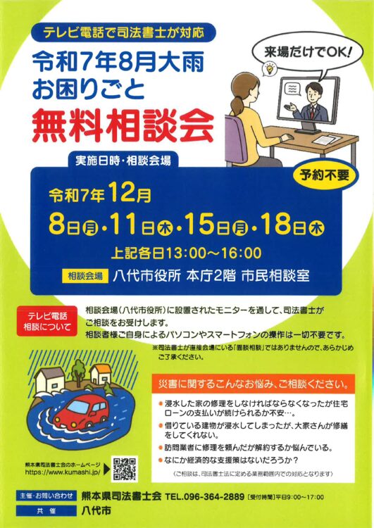 【八代:テレビ電話で司法書士が対応】令和7年8月大雨お困りごと無料相談会