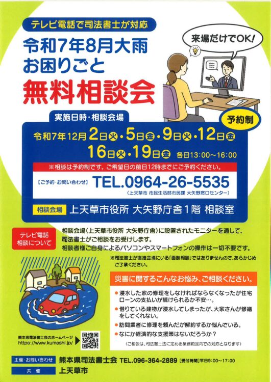 【上天草:テレビ電話で司法書士が対応】令和7年8月大雨お困りごと無料相談会