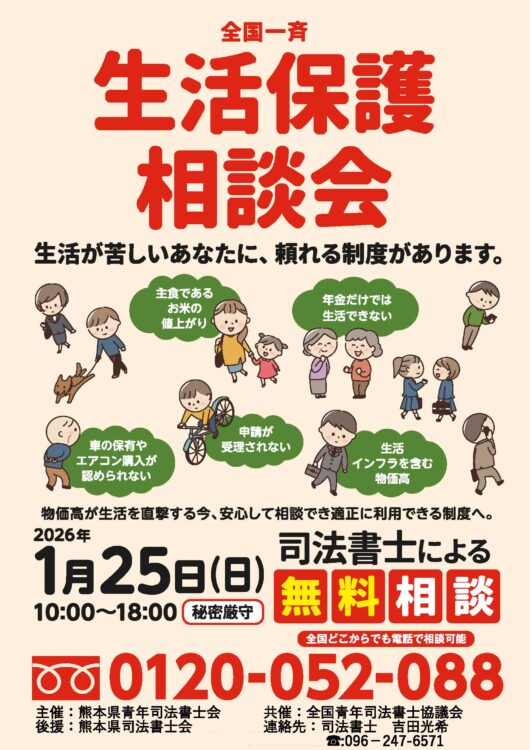 熊本県青年司法書士会では、生活保護に関する無料相談会を開催致します。
