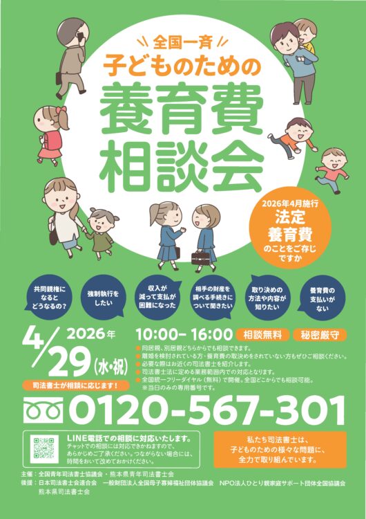 | 備考 | 後援:日本司法書士会連合会 熊本県司法書士会 一般財団法人全国母子寡婦福祉団体協議会 NPO法人ひとり親家庭サポート団体全国協議会 |