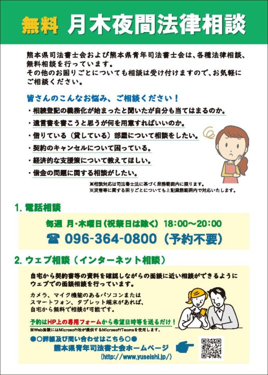 HOME 相談会・イベント 【無料】月木夜間法律相談会 相談会・イベント 【無料】月木夜間法律相談会 熊本市 開催日時 毎週月・木曜日(祝日を除く) 18:00~20:00 場所 熊本県司法書士会館 2階 相談分野 災害, その他 相談方法 電話, web面談 主催 熊本県青年司法書士会 お問合せ 熊本県司法書士会 096-364-2889 備考 相談電話番号:096-364-0800 投稿日 / 2024.08.01 前のページに戻る